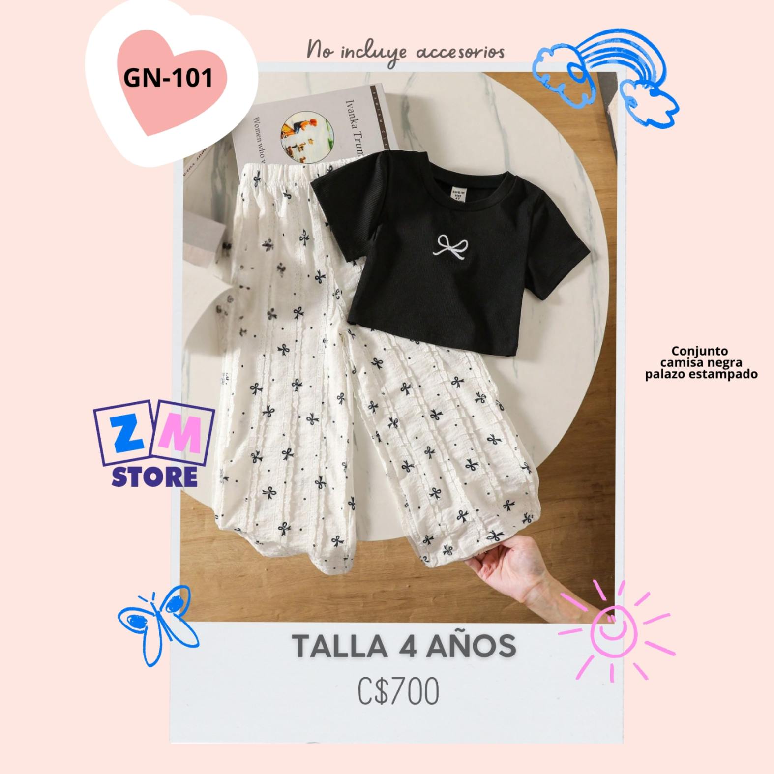 Conjunto con camiseta de manga corta de cuello redondo con estampado de lazo y pantalones de pierna ancha.