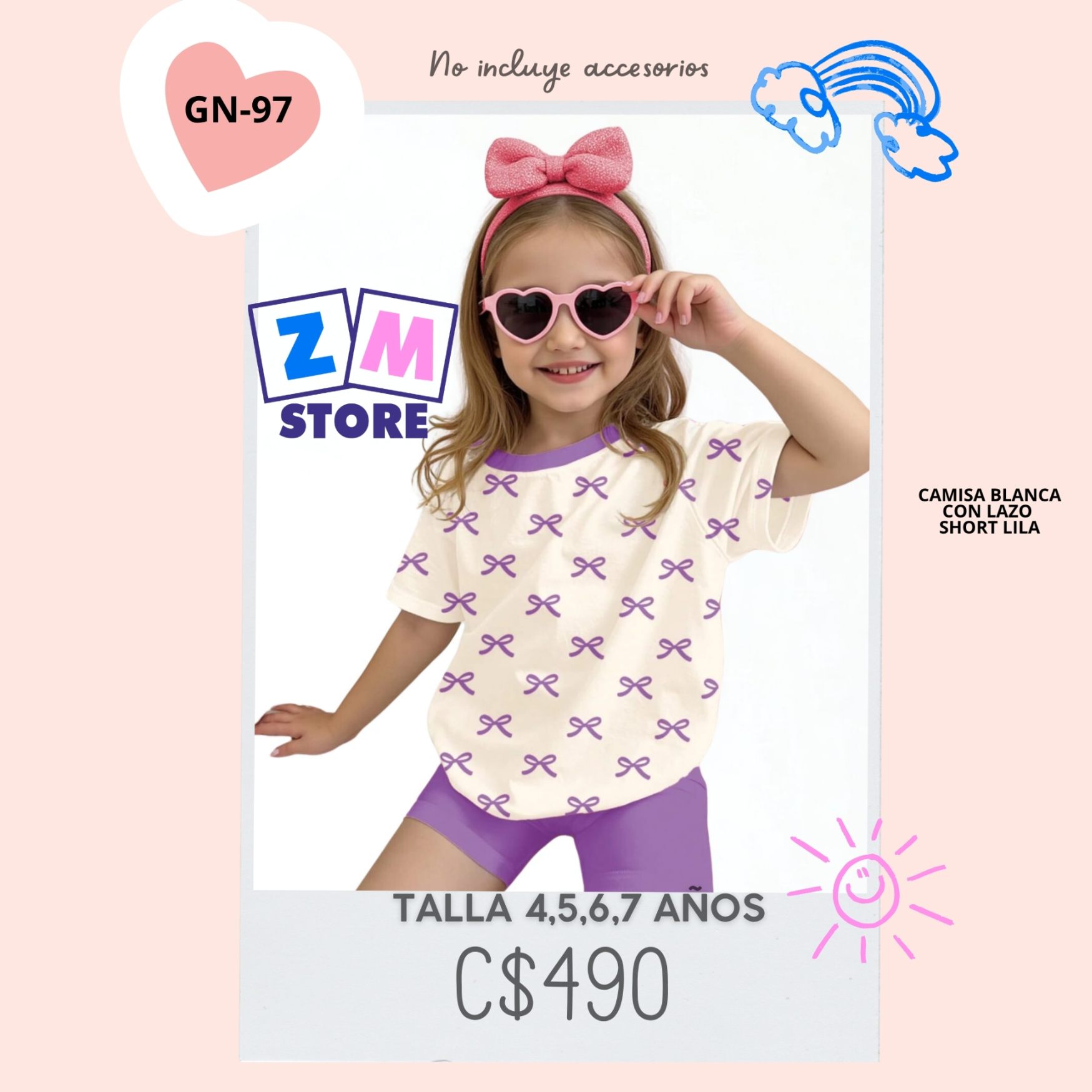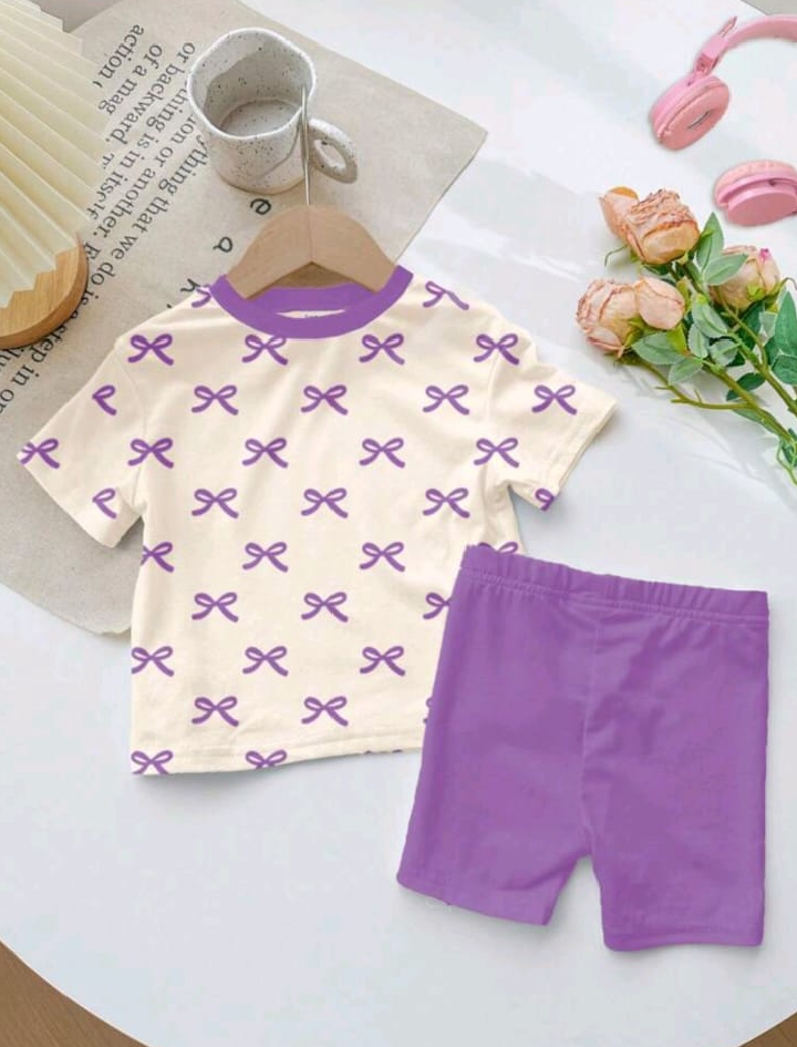 Conjunto de 2 piezas con parte superior de manga corta estampado de lazos en lila, estilo casual minimalista para niña, shorts lila.
