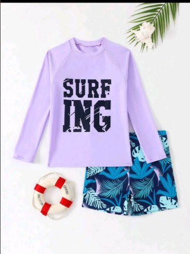 Conjunto de 2 piezas para niño preadolescente con camisa de manga larga cuello redondo estampada con letra y pantalón de baño con estampado de plantas tropicales.